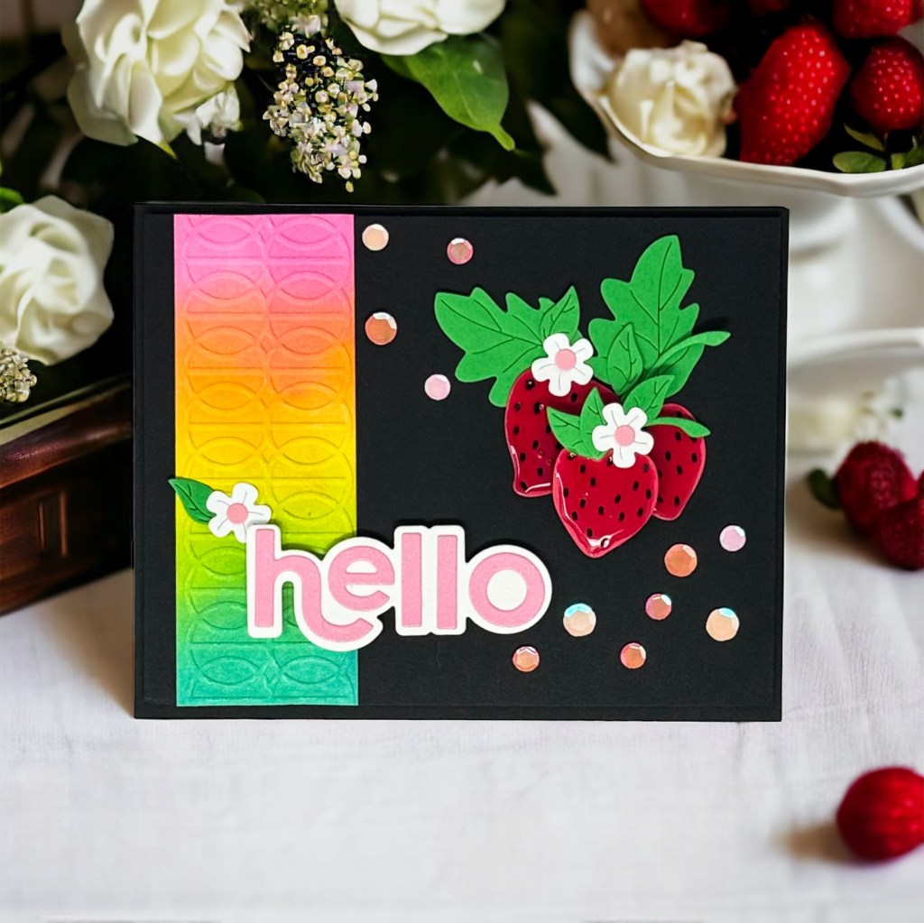 For the strawberry card, I used another die set from the Advent calendar. Remember to put a dark backing behind the “seed” cutouts on the strawberries, or the background color will show through.